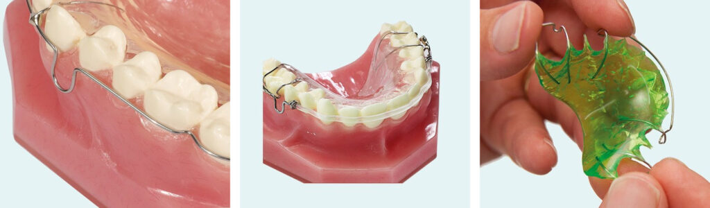 Removable appliance with a clear, aesthetic bow in a medical grade plastic. BPA-free plastic which is resistant to stains and virtually unbreakable. The bow can be adjusted in the surgery to effect minor tooth movements.